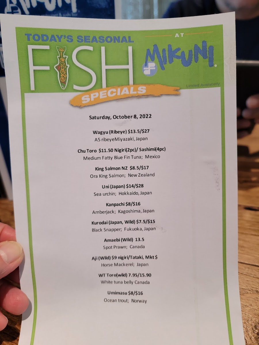 As you step inside, you're welcomed by a beautifully appointed interior that exudes charm and sophistication. With spacious seating and two bars, Mikuni provides a comfortable environment perfect for intimate dinners or lively gatherings with friends. The attentive and friendly staff enhances the experience, ensuring that each guest feels valued and catered to. You're sure to feel right at home as you flip through their extensive menu!